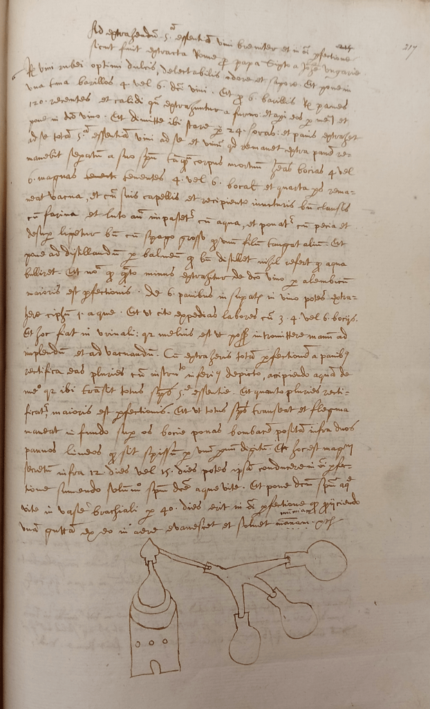 The technological description attributed to a certain Johannes Ungariae, probably trained in Bologna, is in fact a detailed manual of fractional distillation. The text survived in a 1572 copy in the possession of John Elyott. It probably circulated in fifteenth- or sixteenth-century upper ecclesiastical milieus before entering the Sloane Collection, thus bridging late medieval and early modern contexts. This rare example of alchymia operativa, a large-scale recipe for extracting the quintessence of wine, implies a courtly or ecclesiastical laboratory environment closely tied to medicine. Implicitly, it addresses elite demand for highly rectified aqua vitae, while its subsequent transmission through papal and humanist circles situates it within the knowledge economies that would later feed early modern collecting practices, including that of Sir Hans Sloane. Taken together, these materials invite reflection on how late medieval operative alchemy helped to shape techniques of distillation and the dual career of spirits as both a medicinal remedy and a recreational drug.
